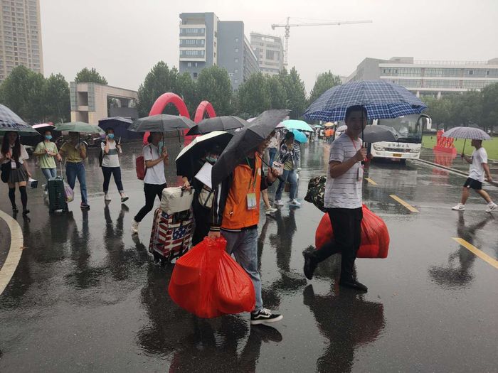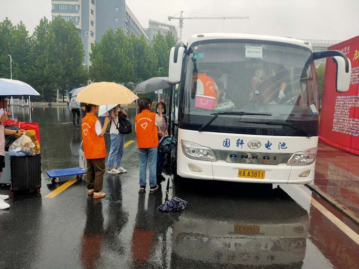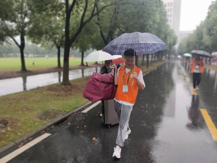 在學校各個門口、咨詢服務點、各學院報到處、新生宿舍,隨處可以看到我校迎新志愿者們忙碌的身影,他們為新生提供校園引導、報到咨詢、行李運送、臨時休息等新生服務。他們身上的志愿者服裝、志愿者證件,如一面面高高飄揚的旗幟,指引著新生同學們。在各車站,志愿者們在出站口迎接著師弟師妹們;在校園路口,志愿者們撐著傘為新生指路,帶領他們去迎新點辦理報到手續;在迎新點,志愿者們幫助新生完成報到流程,幫助他們搬運行李,為他們提供便利。