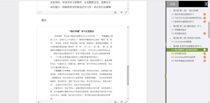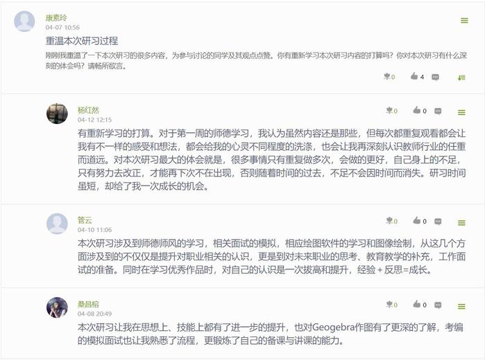 提升教學反思能力。培根鑄魂,啟智潤心。教學是一個長期動態過程,需要教師不斷地反思并且持續地推進育人觀念和育人方式,最終實現育人真諦。為進一步鞏固學習成果,數學與統計系評選出優秀“踐行師德”學習反思報告、優質簡歷及GeoGebra優秀作品,引導學生重溫研習過程、觀摩優秀作品、相互借鑒學習。學生們在學習通平臺上點贊本次活動之余也紛紛發表心得感悟,折射出他們對教師職業生涯規劃和教學方法的思考。院系將同學們的意見收納整理,以便于對研習設計的不足加以改進。