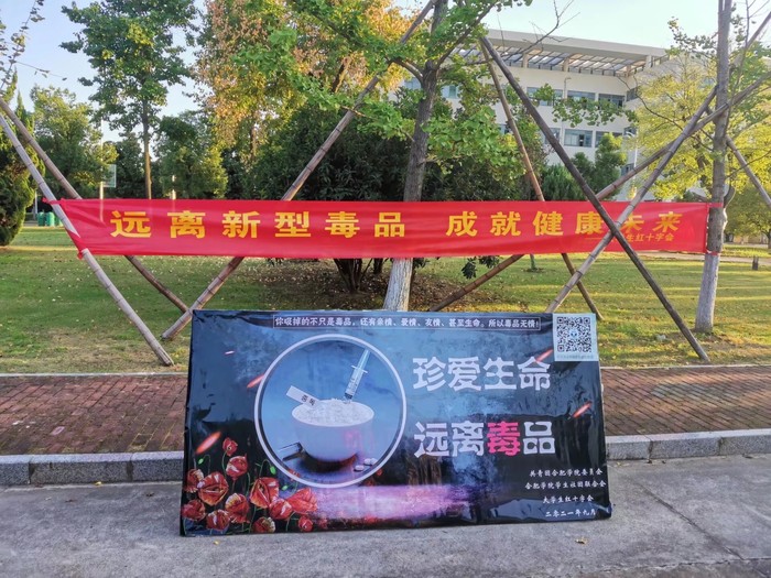 我校是合肥市禁毒高校聯(lián)盟成員校之一,此次禁毒宣傳教育活動依托我校大學(xué)生紅十字會組織開展,在一期和二期校園內(nèi)分別開設(shè)宣傳點,擺放禁毒宣傳教育海報和橫幅。紅十字會的志愿者們通過現(xiàn)場講解毒品危害常識、舉辦毒品危害知識小問答、發(fā)放合肥市禁毒辦統(tǒng)一制作的宣傳小禮品等形式開展宣傳教育活動,引導(dǎo)同學(xué)們關(guān)注國家禁毒的官方微信公眾號,呼吁同學(xué)們提高毒品危害意識,自覺遠離毒品。宣傳期間,我校學(xué)生參與度高,主動了解有關(guān)毒品危害的知識,積極轉(zhuǎn)發(fā)大學(xué)生紅十字會官方平臺的禁毒宣傳文案,活動現(xiàn)場,很多同學(xué)在禁毒橫幅和宣傳展板上簽名。