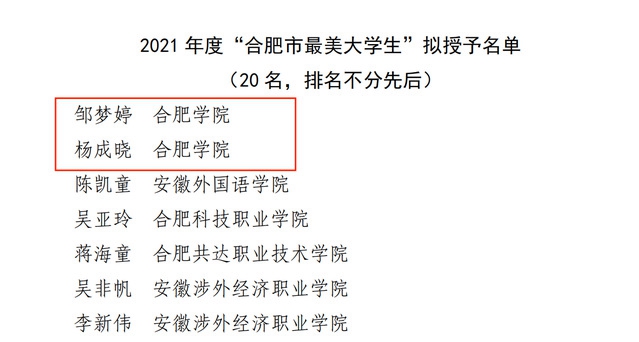 近日,由合肥市教育局、共青團(tuán)合肥市委員會、合肥市學(xué)生聯(lián)合會共同舉辦的尋訪2021年度“合肥市最美學(xué)生”暨第九屆“合肥市十佳學(xué)生”評選活動結(jié)果公布,我校學(xué)子郭兆薇、李慶鋒榮獲“合肥市十佳大學(xué)生”稱號,鄒夢婷、楊成曉榮獲“合肥市最美大學(xué)生”稱號。