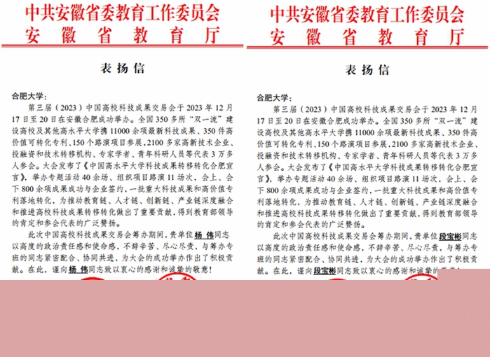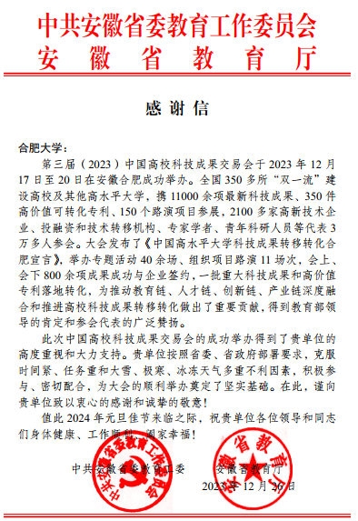 近日,我校收到中共安徽省委教育工作委員會(huì)和安徽省教育廳發(fā)來(lái)的感謝信,對(duì)學(xué)校在第三屆(2023)中國(guó)高校科技成果交易會(huì)籌備工作的貢獻(xiàn)致以衷心的感謝和誠(chéng)摯的敬意。