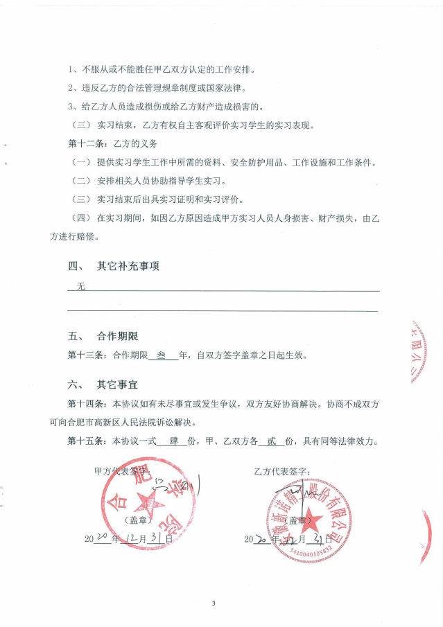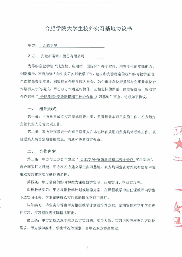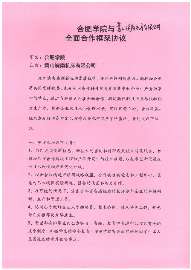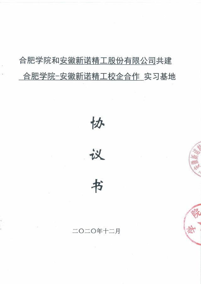 合肥學(xué)院與安徽新諾精工股份有限公司(原黃山皖南機(jī)床有限公司)經(jīng)過友好協(xié)商,于2017年9月簽訂了全面合作框架協(xié)議,正式開啟了合肥學(xué)院-安徽新諾精工校企合作實踐教育基地的建設(shè)。2020年2月,雙方又再次簽署了共建實習(xí)基地的協(xié)議書。合作協(xié)議的簽訂,不但明確了校企雙方在合作基地建設(shè)中的權(quán)利和義務(wù),為雙方順利開展各項實踐教學(xué)工作,高質(zhì)量地培養(yǎng)學(xué)生綜合實踐能力和創(chuàng)新能力奠定了基礎(chǔ);同時也為合作基地的健康發(fā)展,以及校企雙方開展全面合作起到了積極的促進(jìn)作用。