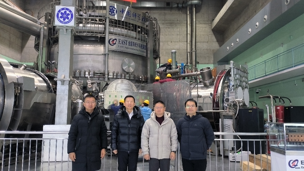在研究院專家的陪同下,學院調研團隊首先參觀了全超導托卡馬克核聚變實驗裝置(EAST,“東方超環”)。EAST有“人造太陽”之稱, 其運行原理是在裝置的真空室內加入少量氫的同位素氘或氚,通過類似變壓器的原理使其產生等離子體,然后提高其密度、溫度使其發生聚變反應,反應過程中會產生巨大的能量。