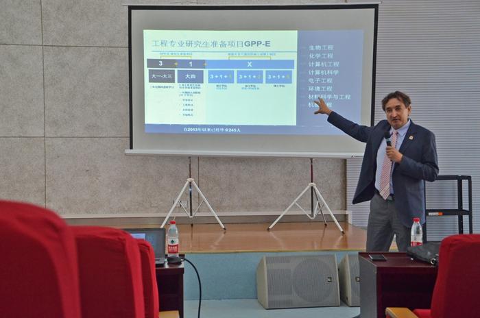 會上,王俊主要從學校概況,城市發展以及項目內容三個方面對“3+1+x”碩博研究生項目進行介紹。他指出,加州大學河濱分校是世界一流綜合性研究型大學、美國著名公立大學、美國國家一級研究型大學、加州大學系統中十所學校之一,也是該系統中發展最快的分校,以其人性化、種族多元化、和世界級研究而著稱。校內設有5座醫學中心,3個國家重點實驗室,150項專業學科。河濱市地理位置優越,擁有大城市的便利及小城鎮的安全和友善,其周圍有豐富的就業機會。隨后,王俊從項目的結構,報名要求,項目特色等方面對“3+1+x”碩博研究生項目進行了說明。