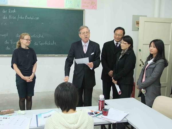 會見后,陶登松書記向芮悟峰博士一行贈送了印章等紀念品,并一起觀看了我院與德國高校合作交流的相關照片,參觀了藝術設計系中德Workshop展覽、管理系的中德合作物流管理專業課堂教學現場及我院新校區建設工地,并同德語專業學生進行了交流,在伍爾夫總統種植的友誼樹前和我院部分師生合影留念。