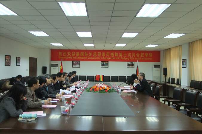 11月8日上午,德國駐滬總領事芮悟峰博士在安徽省外辦涉外領事處副處長呂曉梅的陪同下來我院訪問。我院黨委書記陶登松,黨委委員、紀委書記洪家友,副院長陳秀,院辦主任劉樟樹,宣傳部部長白義香,外事處副處長賈峰,管理系主任李道芳,建筑工程系黨總支書記夏勇,德國下薩克森州代表迪克曼及我院留德歸來的教師代表等在我院南艷湖校區厚德大廈會議室親切接待了來賓。
