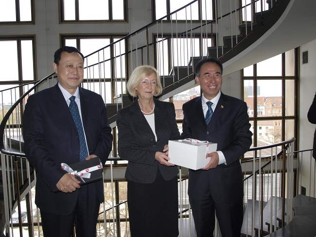 研討會期間,下薩克森州科學文化部部長婉卡博士、教授在科文部與安徽省教育廳廳長程藝、我院院長蔡敬民舉行了會談,雙方回顧兩省州高等教育的合作成就,就進一步加強、加深兩省州高等院校以及應用型高校間的合作與交流舉行會談。(外事處)