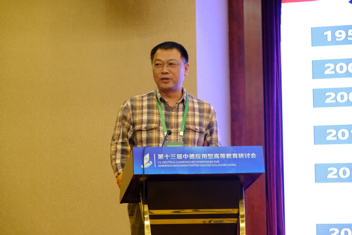 亨德里克·拉克勒以《職業(yè)教育與學(xué)術(shù)教育的有機融合——以新建的漢堡職業(yè)大學(xué)為例》為主題,指出了學(xué)術(shù)和職業(yè)教育融合的新模式,為應(yīng)用型大學(xué)的發(fā)展提供了新思路和方法。報告過程中,亨德里克·拉克勒具體介紹了漢堡職業(yè)大學(xué)的運行機制,并指出一體化教育培訓(xùn)模式會成為雙元制大學(xué)教育機制的有力補充。