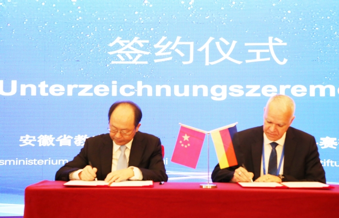 大會(huì)舉行了簽約儀式,錢桂侖和喬治·施泰德作為雙方代表簽訂了合作協(xié)議。未來雙方將圍繞“教學(xué)方案研討”、“提升教師教學(xué)以及實(shí)踐能力”、“引入以實(shí)踐為導(dǎo)向教學(xué)理念”為主題的師資培訓(xùn),建立建設(shè)能力培訓(xùn)中心,建立教學(xué)質(zhì)量管理體系等方面開展合作,進(jìn)一步增進(jìn)中德兩國在教育領(lǐng)域的交流與友誼,促進(jìn)安徽省職業(yè)教育發(fā)展。