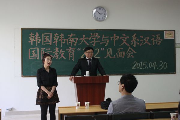 4月30日下午,訪問我院的韓南大學副校長金龍還先生專程來到一期善思樓C座,與中文系漢語國際教育專業“2+2”項目全體學生舉行見面會。見面會由中文系主任詹向紅教授主持,韓南大學對外協力處處長李承護先生、韓籍教師閔詠大教授、中文系“2+2”項目負責人張發清副教授等參加了此次見面會。