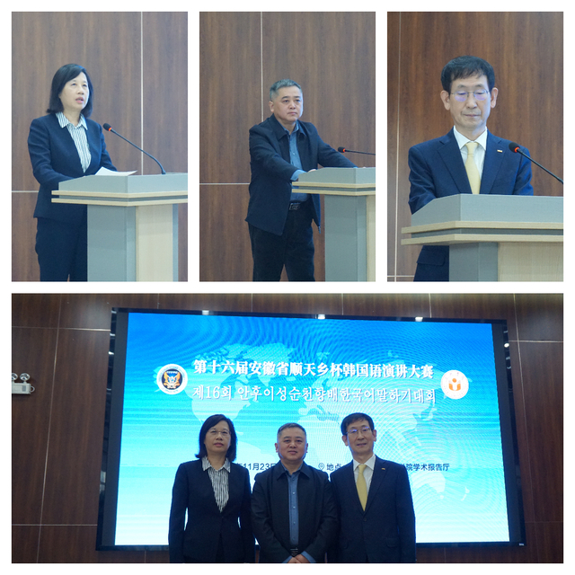 11月23日,由安徽省教育廳主辦、合肥學(xué)院和韓國順天鄉(xiāng)大學(xué)承辦的第十六屆安徽省順天鄉(xiāng)杯韓國語演講大賽在我校成功舉辦。安徽省教育廳外事處處長姚德勇、校長吳春梅和順天鄉(xiāng)大學(xué)副校長金瑃淳在開幕式上致辭,順天鄉(xiāng)大學(xué)柳炳旭、金仁榮和林麗明三位教授擔(dān)任大賽評委。