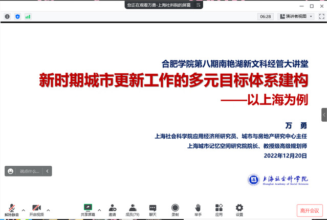 12月20日下午,經(jīng)濟與管理學院第八期南艷湖新文科經(jīng)管大講堂于線上舉行,上海社會科學院城市與房地產(chǎn)研究室主任、研究員萬勇教授應邀開展學術講座。本次講座特邀旅游與會展學院院長宋玉軍主持,經(jīng)管學院青年教師及部分學生120余人參會。