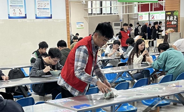 首先由志愿活動負責人對志愿者進行分工并簽到,將參加活動的志愿者分組編隊。然后,志愿者們配合食堂阿姨對飯后餐具進行整理回收,對食堂桌面進行擦拭以便之后的同學進餐。各隊成員相互監督,互相配合不怕臟,不怕累,爭著做,走一路,干一路,出色地完成了清潔食堂的志愿活動結束后志愿者整理志愿服并放到指定位置順利完成簽退。