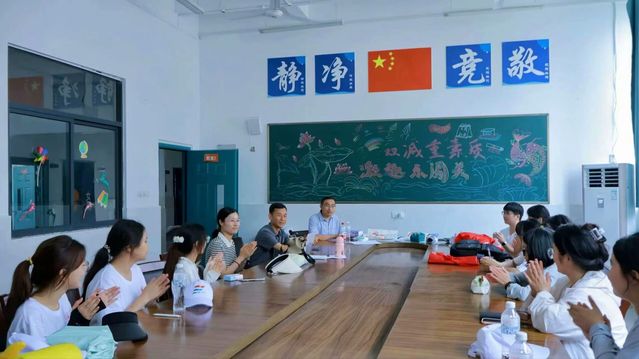 安全為先,共筑防線。在順利抵達實踐地點后,蜀山行知學校的領導和老師們帶領團隊成員參觀校園并強調活動開展的注意事項。隨后,團隊成員入住宿舍進行簡單休整。下午兩點,全體成員第一次全體會議召開,蜀山行知學校校長孫習春、教育學院黨委書記劉良宏、團委副書記張弦樂出席。會議伊始,劉書記強調了本次活動的安全問題,要求成員時刻保持手機暢通,牢記安全底線。隨后,孫校長表示學校會在日常生活和活動開展上給予力所能及的幫助與支持,做好后勤保障工作。最后,張老師再次強調本次三下鄉相關活動事宜,勉勵成員們在實踐中增長才干,發揚“奉獻、友愛、互助、進步”志愿服務精神。