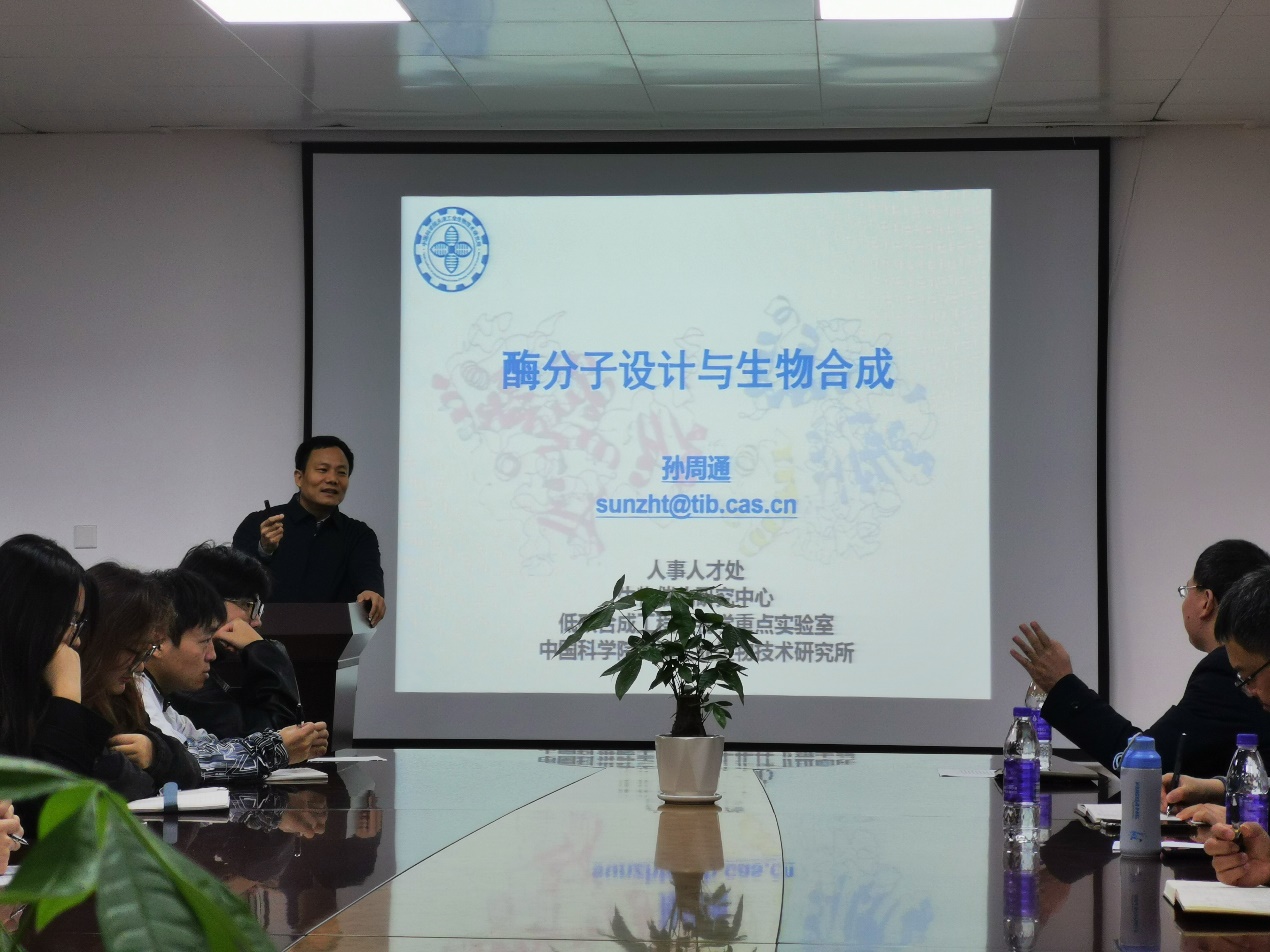 報告在生物食品與環(huán)境學(xué)院會議室舉行,阮班鋒院長首先介紹了孫周通研究員的簡歷和成果,參會師生以熱烈的掌聲歡迎孫老師的到來和分享。孫老師首先介紹合成生物技術(shù)產(chǎn)業(yè)發(fā)展和概況,強調(diào)合成生物學(xué)突破傳統(tǒng)領(lǐng)域技術(shù)內(nèi)卷,多學(xué)科融合創(chuàng)制合成生物,打造循環(huán)經(jīng)濟的新增長點,建立人類社會生活新模式。接下來以諾貝爾獎為背景,提出了合成生物學(xué)解析遺傳與進化的金鑰匙——酶。孫老師認(rèn)為,酶作為催化劑被廣泛應(yīng)用于醫(yī)藥與健康、能源與材料、食品與環(huán)境等人類生產(chǎn)生活的多方面,但對其結(jié)構(gòu)與功能的認(rèn)知依然非常有限,而且其自然屬性與應(yīng)用屬性之間的不匹配阻礙了對酶資源的有效利用。酶的突變是其功能進化的源動力,現(xiàn)有技術(shù)手段無法解析酶催化反應(yīng)的動態(tài)全景,而定向進化高度依賴篩選體系和高通量設(shè)備,人工智能又高度依賴真實數(shù)據(jù),尤其針對手性控制的設(shè)計缺乏有效手段,因此對其開展高效設(shè)計充滿挑戰(zhàn)。最后,孫老師結(jié)合自己課題組的工作:圍繞工業(yè)酶設(shè)計與綠色生物催化,重點開展酶分子工程、代謝工程與合成生物學(xué)等方向的基礎(chǔ)與應(yīng)用研究,說明酶分子工程可通過降維設(shè)計和有限定向(篩選)有效解決新酶設(shè)計與新反應(yīng)實現(xiàn)的困境。報告完成后,孫老師與學(xué)院師生進行了深入的交流和討論,幫助大家解決科研實踐中遇到的困惑和難題。