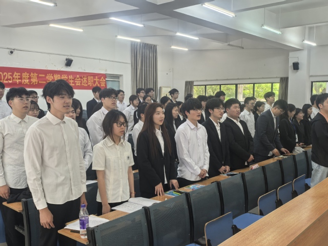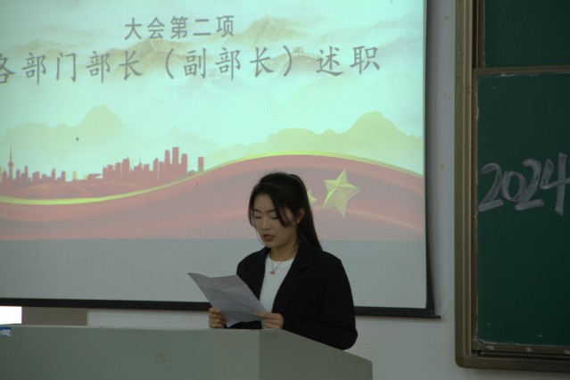 大會伊始,由主持人曠家昱上前致辭,宣布大會開始。大會第一項,全體起立,奏唱共青團團歌,在一聲聲莊嚴的團歌渲染下,全體成員不禁面容莊重,共唱共青團團歌。大會第二項,由各部門部長述職,各部長講述了各自部門的工作成果、不足之處、未來規劃以及感謝寄言。大會第三項,由主席團代表成曉超進行全面述職。在過去的一年里,學生會秉持“全心全意為同學服務”的宗旨,扎實推進各項工作,豐富同學們課余生活,展現了生會積極進取、追求卓越的決心。大會第四項,院團委負責人楊林對學生會的工作做出指導,希望各部門充分發揮學生組織的示范引領作用,為學校發展和同學成長貢獻更多青春力量。大會最后一項,李秀娟做總結講話。她對學生會成員的辛勤付出給予高度贊揚,強調學生會要始終堅持正確的政治方向,并結合自身經驗希望學生會以此次述職大會為契機,總結經驗、正視不足,加強自身建設。