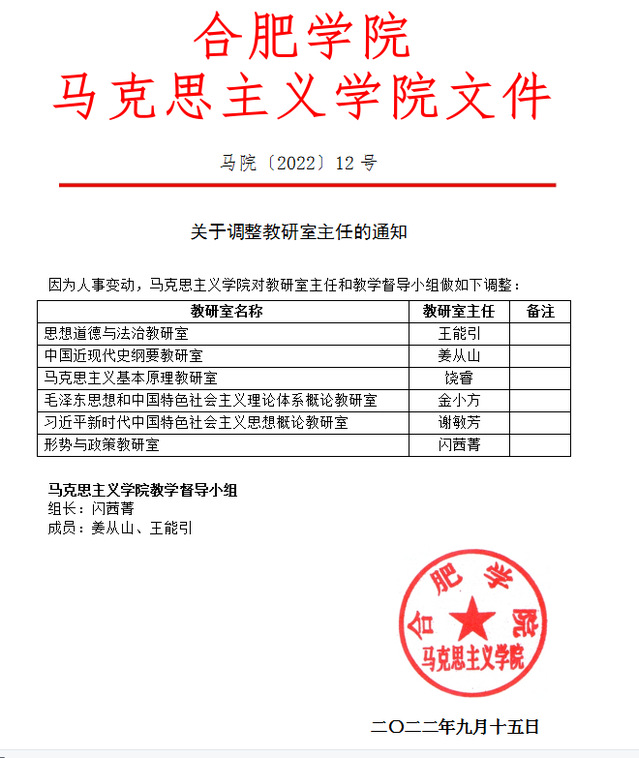 關于調整教研室主任的通知(馬院〔2022〕12號)