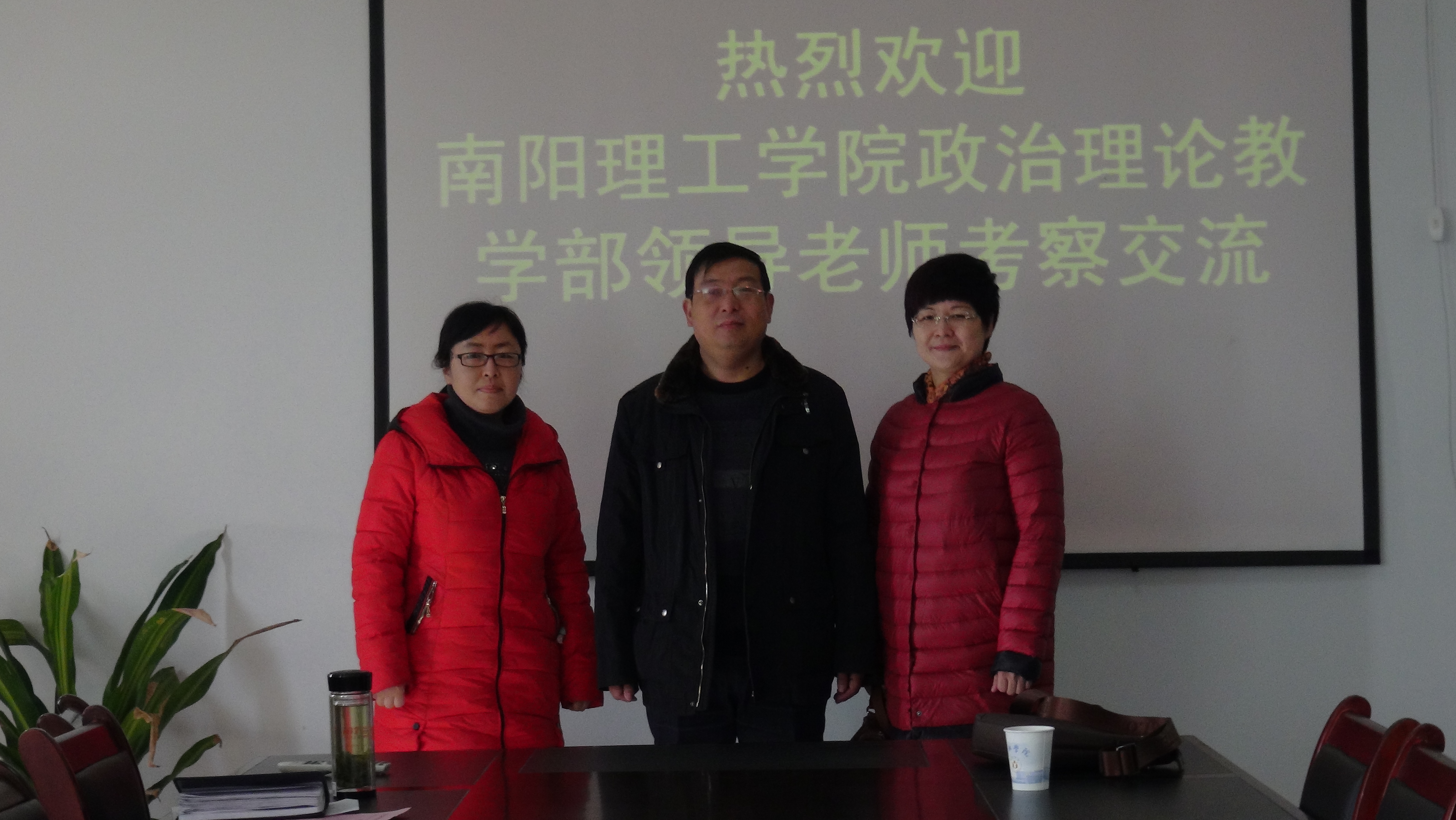 201511月26日下午,南陽理工學院政治理論教學部主任王富祥等一行來合肥學院思政部考察交流,主要考察合肥學院思政課教學改革與特色工作以及《思想道德修養與法律基礎》課、《形勢與政策》課的課程建設情況。思政部教務辦公室主任劉昆博士熱情接待了南陽理工學院政治理論教學部的領導同行。
